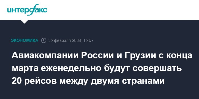 Тбилиси. 25 февраля. INTERFAX.RU - Воздушное сообщение между Грузией и Россией, как ожидается, будет восстановлено на паритетной основе, в том же объеме, что существовал до прекращения авиарейсов между двумя странами, сообщил руководитель транспортной администрации министерства экономического развития Грузии Ираклий Таварткиладзе.