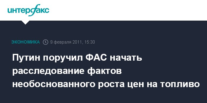 Санкт-Петербург. 9 февраля. INTERFAX.RU - Глава правительства РФ Владимир Путин дал поручение Федеральной антимонопольной службе (ФАС) начинать антимонопольные расследования по любым фактам необоснованного завышения цен на топливо.