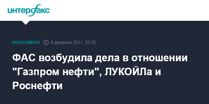 Москва. 9 февраля. INTERFAX.RU - Федеральная антимонопольная служба РФ в четверг приняла решение о возбуждении дел в отношении трех нефтяных компаний - "Газпром нефти", "ЛУКОЙЛа" и "Роснефти" по признакам нарушения антимонопольного законодательства.