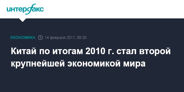 Москва. 14 февраля. INTERFAX.RU - Китай, как стало окончательно ясно после публикации в понедельник данных о ВВП Японии за 2010 г., официально получил статус второй крупнейшей экономики мира и уступает теперь по этому показателю лишь США.