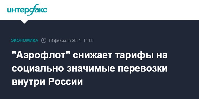 Москва. 18 февраля. INTERFAX.RU - ОАО "Аэрофлот - российские авиалинии" снижает тарифы на социально значимые перевозки внутри России, говорится в сообщении авиакомпании.