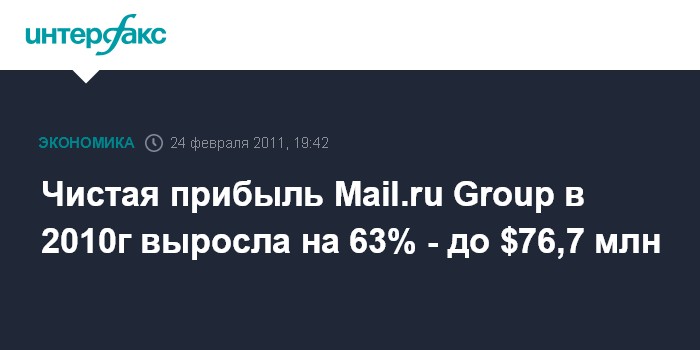Москва. 24 февраля. INTERFAX.RU - Чистая прибыль Mail.ru Group по итогам 2010 года выросла на 63% по сравнению с 2009 г. и составила $76,7 млн, говорится в сообщении компании.