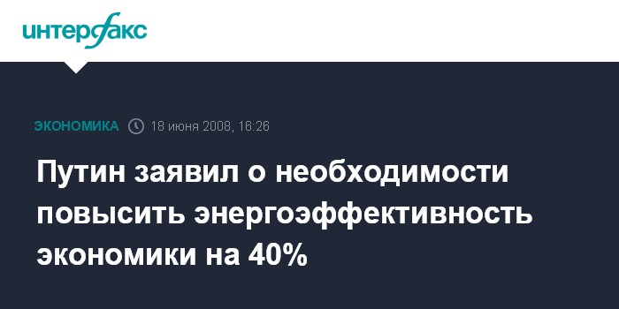Москва. 18 июня. ИНТЕРФАКС - Необходимо повысить энергоэффективность экономики России не менее чем на 40% к 2020 году, заявил председатель правительства Владимир Путин на совещании по развитию электроэнергетики в среду в Минэнерго.