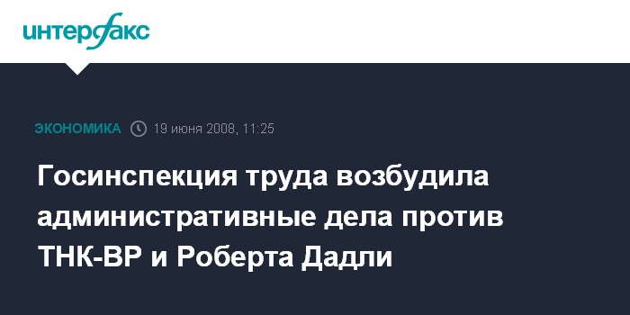 Он уточнил, что дела возбуждены на основании ч.1 ст.5.27 Кодекса РФ об административных правонарушениях. "По итогам внеплановой проверки выявлены ряд нарушений законодательства об охране труда, которые можно отнести к существенным. В частности, оформление документов при приеме на работу, сроки выплаты заработной платы и т.д.", - сказал собеседник агентства, добавив, что инспекция уже вручила представителям "ТНК-ВР Менеджмент" акт предписания о выявленных нарушениях и необходимости их устранения, а также направила соответствующий документ на имя Роберта Дадли.