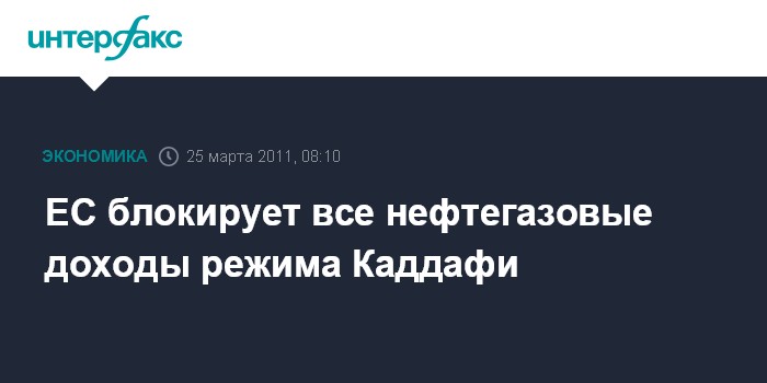 Брюссель. 25 марта. INTERFAX.RU - Евросоюз готов заблокировать все доходы от нефти и газа, которыми может воспользоваться режим Муаммара Каддафи в Ливии.