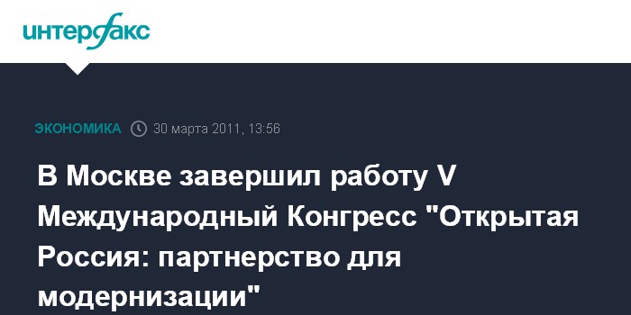 Москва. 30 марта. INTERFAX.RU - В Москве завершил свою работу V Международный Конгресс "Открытая Россия: партнерство для модернизации", посвященный проблемам адаптации российского бизнеса к новым внешнеэкономическим условиям в рамках вступления России в ВТО.