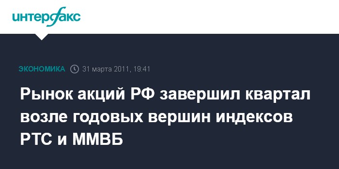 Москва. 31 марта. INTERFAX.RU - Российский рынок акций завершил первый квартал возле годовых вершин индексов РТС и ММВБ благодаря выросшей нефти и позитивной динамике мировых фондовых площадок.