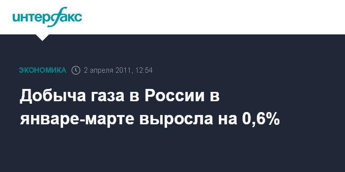 Москва. 2 апреля. INTERFAX.RU - Объем добычи газа в РФ в январе-марте 2011 года вырос на 0,6% по сравнению с аналогичным показателем 2010 года и составил 182,776 млрд куб. м. Такие данные содержатся в оперативной сводке ГП "ЦДУ ТЭК". Между тем по итогам первых двух месяцев текущего года производство газа в России было ниже уровня прошлого года на 0,5%. В марте 2011 года в РФ было добыто 61,537 млрд куб. м "голубого топлива".