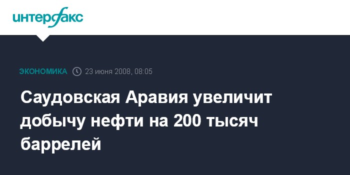 Москва. 23 июня. INTERFAX.RU - Саудовская Аравия заявила ввчера на международной конференции производителей и потребителей нефти, что готова увеличить добычу нефти на весь период до конца года на 200 тыс. баррелей в сутки, чтобы сдержать рост цен.