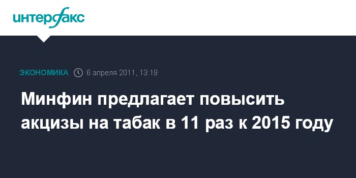 Москва. 6 апреля. INTERFAX.RU - Минфин РФ предлагает повысить акцизы на табачную продукцию к 2015 году до уровня 3 тыс. рублей за 1 тыс. сигарет с нынешних 270 рублей, сказал вице-премьер, министр финансов РФ Алексей Кудрин, выступая перед депутатами Госдумы в среду.