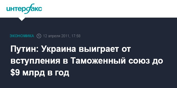 Киев. 12 апреля. ИНТЕРФАКС - Прямой выигрыш Украины от вступления в таможенный союз может составить от $6,5 до $9 млрд в год, заявил премьер-министр РФ Владимир Путин.