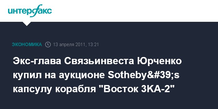 Москва. 13 апреля. INTERFAX.RU - Бывший генеральный директор ОАО "Связьинвест" Евгений Юрченко во вторник приобрел на аукционе Sotheby's спускаемый аппарат "Восток 3KA-2", говорится в сообщении инвестфонда имени Попова, председателем которого является Юрченко.