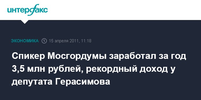 Москва. 15 апреля. ИНТЕРФАКС-МОСКВА - Больше других в 2010 году среди депутатов Мосгордумы заработал глава парламентской комиссии по культуре и массовым коммуникациям, режиссер Евгений Герасимов.