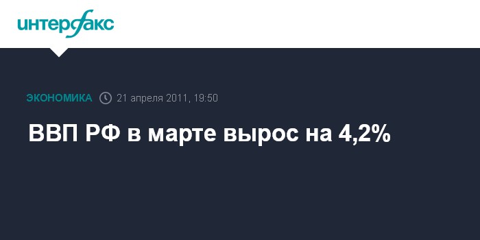 Москва. 21 апреля. INTERFAX.RU - ВВП РФ в марте 2011 года вырос на 4,2% по сравнению с мартом 2010 года, сообщил журналистам заместитель главы Минэкономразвития Андрей Клепач.