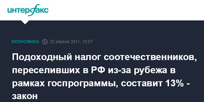 Подоходный налог соотечественников, переселивших в РФ из-за рубежа в рамках госпрограммы, составит 13% - закон