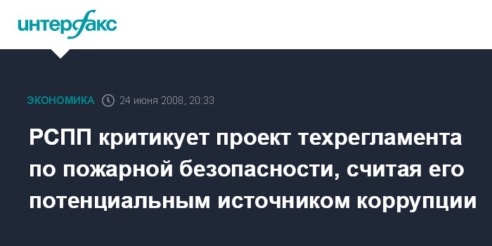 Москва. 24 июня. ИНТЕРФАКС - Российский союз промышленников и предпринимателей подверг критике проект технического регламента "Общие требования пожарной безопасности", готовящийся в Госдуме, как потенциальный источник коррупции.