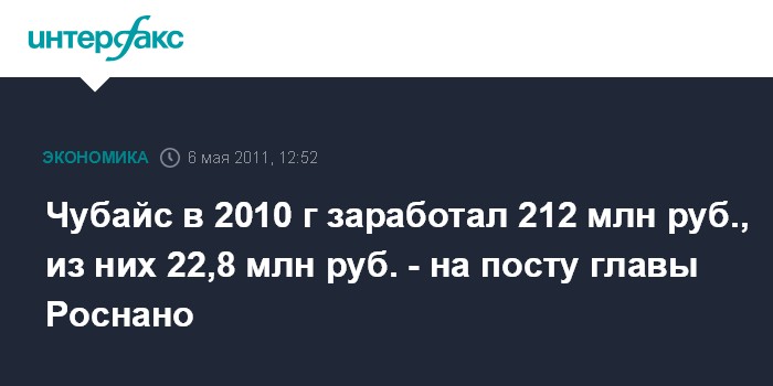 Чубайс в 2010 г заработал 212 млн руб., из них 22,8 млн руб. - на посту главы Роснано