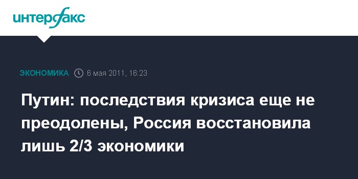 Волгоград. 6 мая. INTERFAX.RU - Премьер-министр РФ Владимир Путин заявил, что после мирового финансового кризиса восстановлено только две трети российской экономики.