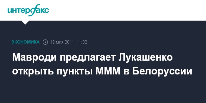 Минск. 12 мая. INTERFAX.RU - Основатель финансовой пирамиды МММ Сергей Мавроди предложил президенту Белоруссии Александру Лукашенко открыть пункты МММ по всей республике для того, чтобы связать избыточные средства населения, остановить инфляцию и девальвацию белорусского рубля.