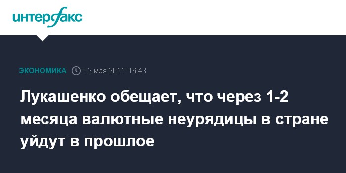 Минск. 12 мая. INTERFAX.RU - Президент Белоруссии Александр Лукашенко пообещал, что в Белоруссии через 1-2 месяца будет урегулирована ситуация на валютном рынке, сообщают белорусские государственные СМИ.