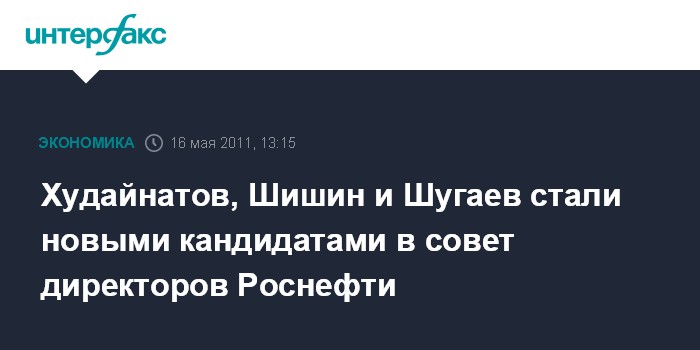 Москва. 16 мая. INTERFAX.RU - Президент НК "Роснефть" Эдуард Худайнатов, старший вице-президент ВТБ Сергей Шишин и заместитель генерального директора госкорпорации "Ростехнологии" Дмитрий Шугаев вошли в список кандидатов в совет директоров НК "Роснефть" для избрания на годовом собрании акционеров нефтяной компании.