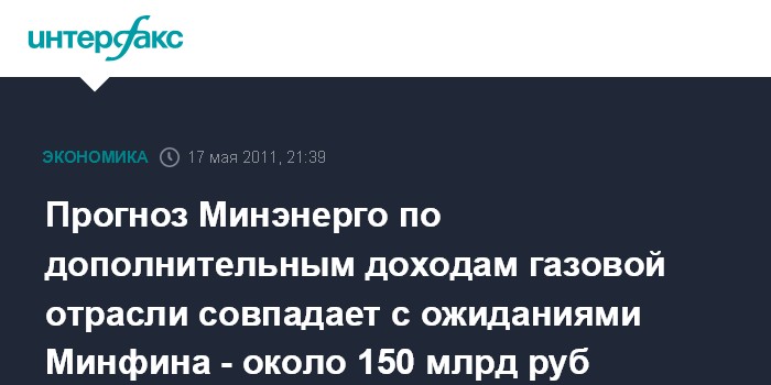 Прогноз Минэнерго по дополнительным доходам газовой отрасли совпадает с ожиданиями Минфина - около 150 млрд руб