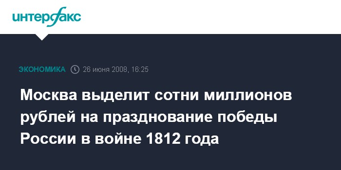 Москва. 26 июня. INTERFAX.RU - Власти Москвы выделили 225 млн рублей на подготовку и празднование 200-летнего юбилея победы России в Отечественной войне 1812 г., однако расходы могут значительно увеличиться, сообщил "Интерфаксу" первый заместитель мэра в правительстве столицы Юрий Росляк.
