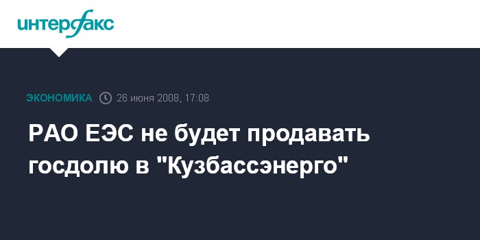 Москва. 26 июня. INTERFAX.RU - РАО "ЕЭС России" не будет продавать часть своего пакета в ОАО "Кузбассэнерго", приходящуюся на долю государства, в связи с отсутствием разрешения правительства РФ, сообщили "Интерфаксу" в энергохолдинге.