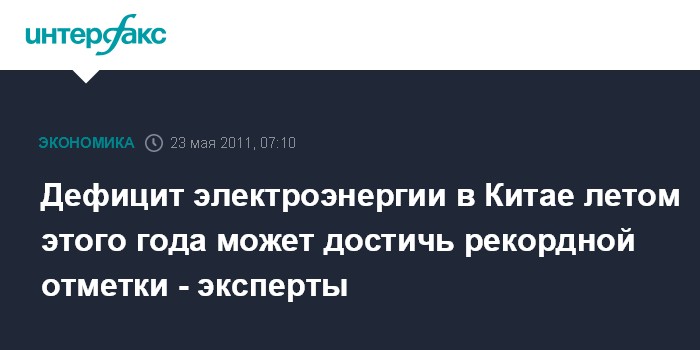 Пекин. 23 мая. ИНТЕРФАКС-КИТАЙ - В наиболее активный - летний - период потребления электроэнергии в текущем году в Китае ожидается рекордный уровень дефицита электричества, сообщила в понедельник газета "Цзинцзи цанькао бао".