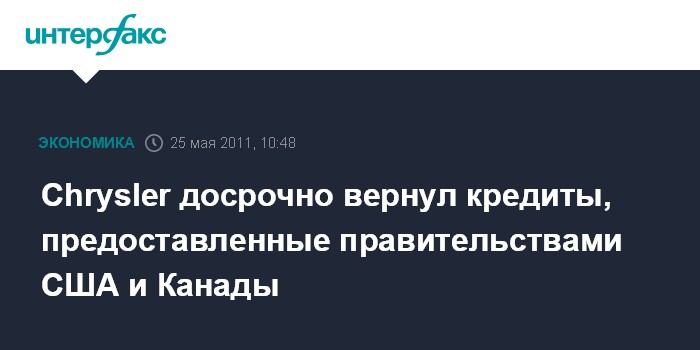 Детройт. 25 мая. INTERFAX.RU - Американский автомобилестроительный концерн Chrysler вернул кредиты общим объемом $7,6 млрд, полученные от правительств США и Канады во время кризиса, на шесть лет раньше срока.