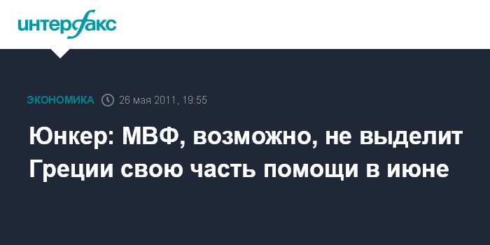 Люксембург. 27 мая. INTERFAX.RU - Международный валютный фонд (МВФ), возможно, не выделит Греции свою часть помощи в июне, заявил премьер-министр Люксембурга Жан-Клод Юнкер, возглавляющий группу министров финансов стран еврозоны.