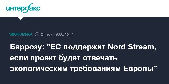 Москва. 27 июня. INTERFAX.RU - Евросоюз поддержит проект Nord Stream, если он будет отвечать экологическим требованиям Евросоюза, заявил председатель Еврокомиссии Жозе Мануэл Баррозу. "Мы поддержим проект при условии, что он совместим с вопросами охраны окружающей среды в Европейском Союзе", - сказал он на пресс-конференции по итогам саммита РФ - ЕС в пятницу в Ханты-Мансийске.