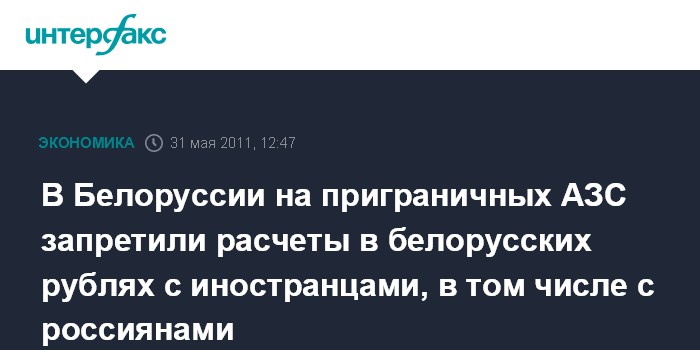 Минск. 31 мая. INTERFAX.RU - Концерн "Белнефтехим" поручил АЗС, которые принадлежат государственному ПО "Белоруснефть" и находятся в приграничной зоне и на крупных автомагистралях, продавать топливо нерезидентам Белоруссии, в том числе россиянам, только за валюту - доллары, евро, российские рубли.