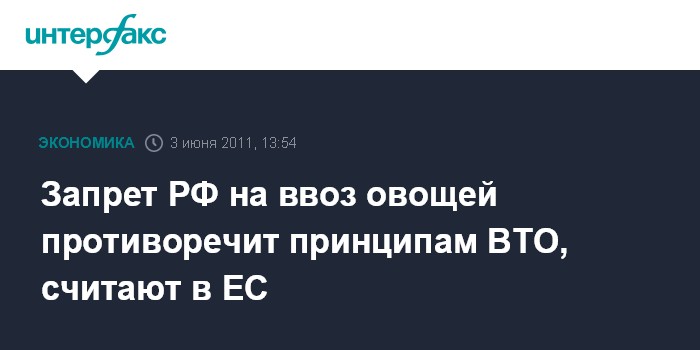 Москва. 3 июня. INTERFAX.RU - Запрет Россией ввоза всех овощей из всех стран-членов Евросоюза идет вразрез с принципами ВТО, куда Россия планирует вступить в ближайшем будущем, заявил представитель Евросоюза в Москве Фернандо Валенсуэла.