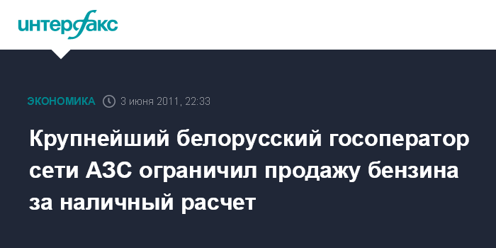Минск. 3 июня. ИНТЕРФАКС-ЗАПАД- Крупнейший белорусский госоператор сети АЗС ПО "Белоруснефть" в пятницу ввел ограничения на покупку бензина и дизтоплива за наличный расчет.