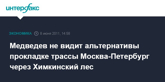 Москва. 8 июня. INTERFAX.RU - Альтернативы прокладки трассы "Москва - Санкт-Петербург" через Химкинский лес в настоящее время нет, проложить другой маршрут помешало правительство Москвы, заявил президент РФ Дмитрий Медведев.