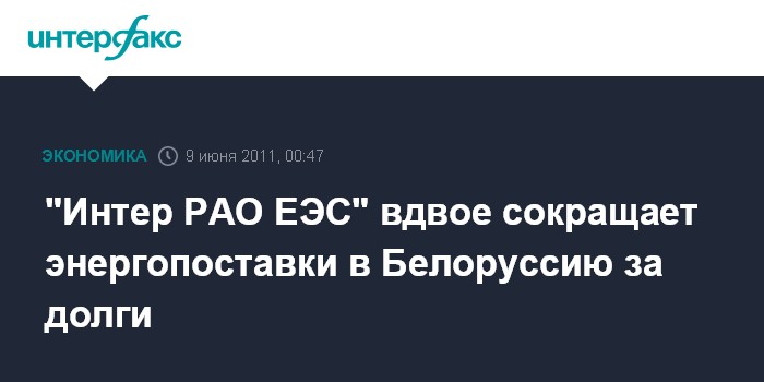 Москва. 9 июня. ИНТЕРФАКС - Российский монополист в сфере экспорта-импорта электроэнергии ОАО "Интер РАО ЕЭС" в 0:00 9 июня ограничивает поставки электроэнергии и мощности в Белоруссию, сообщил "Интерфаксу" источник, близкий к компании.