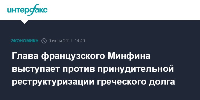 Пекин. 9 июня. INTERFAX.RU - Министр финансов Франции Кристин Лагард, выдвинувшая свою кандидатуру на пост главы Международного валютного фонда (МВФ), полагает, что никакое решение проблемы греческого долга не может подразумевать принудительную реструктуризацию, сообщает агентство Bloomberg.