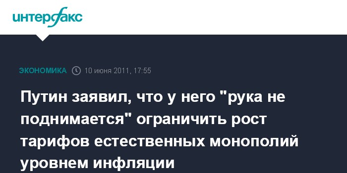 "До сих пор у меня рука не поднялась, чтобы подписать постановление: ограничить рост тарифов так называемых естественных монополий - РАО РЖД, по газу, по электричеству - только ростом инфляции в следующем годы", - сказал Путин.