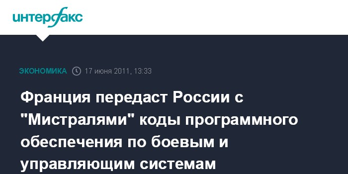 Санкт-Петербург. 17 июня. INTERFAX.RU - По контрактам по вертолетоносцам "Мистраль" Франция готова передать России в том числе и боевые технологии, и в частности, по боевым информационным управляющим системам, сообщил глава Объединенной судостроительной компании Роман Троценко.
