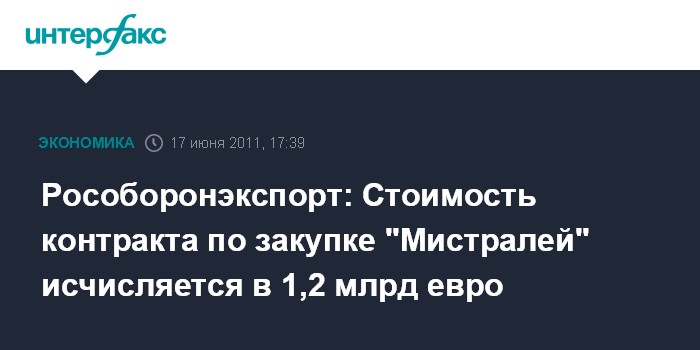 Санкт-Петербург. 17 июня. INTERFAX.RU - Стоимость контракта на поставку "Мистралей" 1,2 млрд евро, сообщил в пятницу журналистам директор Рособоронэкспорта Анатолий Исайкин.
