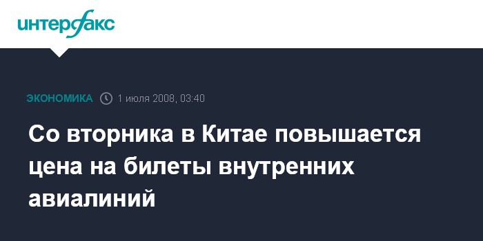 Пекин. 1 июля. ИНТЕРФАКС-КИТАЙ - С 1 июля 20 в Китае повышается цена на билеты внутренних авиалиний, сообщила во вторник газета "Наньфан жибао" со ссылкой на решение госкомитета КНР по развитию и реформам и управление гражданской администрации Китая.