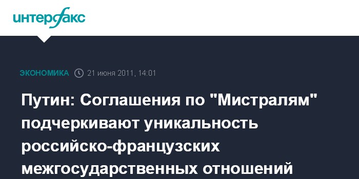 Париж. 21 июня. INTERFAX.RU - Премьер-министр РФ Владимир Путин заявил, что соглашение по "Мистралю" является подтверждением уникального характера российско-французских межгосударственных отношений.