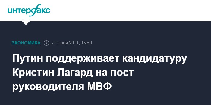 Париж. 21 июня. INTERFAX.RU - Министр финансов Франции Кристин Лагард достойна поста директора-распорядителя МВФ, считает премьер-министр РФ Владимир Путин.