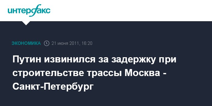 Москва. 21 июня. INTERFAX.RU - Премьер-министр РФ Владимир Путин извинился перед участниками строительства трассы Москва - Санкт-Петербург за задержку. Премьер заявил, что задержка была вынужденной - необходимо было провести дополнительный экологический анализ проекта.