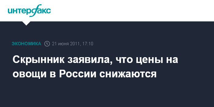 Москва. 21 июня. INTERFAX.RU - Цены на овощи в России продолжают снижаться, заявила глава Минсельхоза Елена Скрынник на оперативном видеосовещании в министерстве во вторник. По ее словам, ситуация на российском рынке овощной продукции - стабильная.