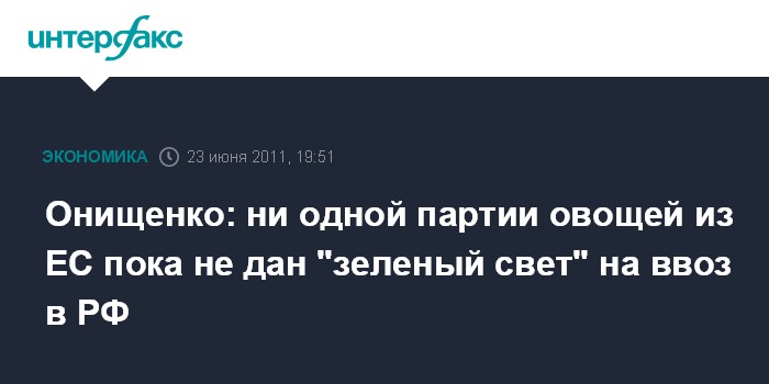 Москва. 23 июня. INTERFAX.RU - Ни одна партия свежих овощей из ЕС пока не получила разрешения на ввоз в Россию, сообщил "Интерфаксу" в четверг вечером руководитель Роспотребнадзора, главный государственный санитарный врач РФ Геннадий Онищенко.