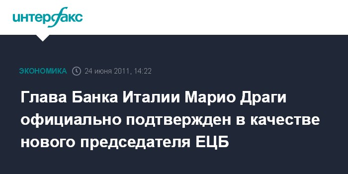 Брюссель. 24 июня. INTERFAX.RU - Лидеры стран еврозоны утвердили кандидатуру главы Банка Италии Марио Драги на посту председателя Европейского центрального банка (ЕЦБ), сообщает агентство Bloomberg.