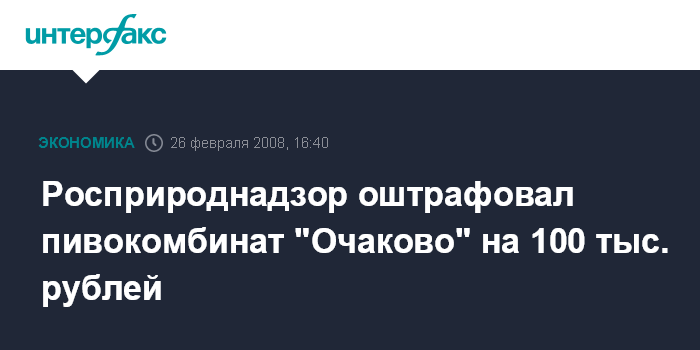 Москва. 26 февраля. INTERFAX.RU - Росприроднадзор оштрафовал московский пивобезалкогольный комбинат "Очаково" на 100 тыс. рублей.