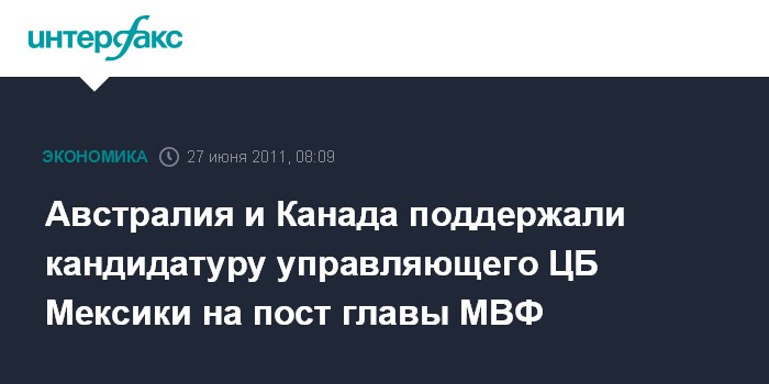 Москва. 27 июня. INTERFAX.RU - Глава Центрального банка Мексики Агустин Карстенс, претендующий на пост директора-распорядителя Международного валютного фонда, заручился в пятницу поддержкой своей кандидатуры со стороны Австралии и Канады, сообщает The Wall Street Journal.